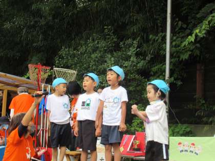 最後に閉会式。きぬた会からいただいたキラキラのメダルやトロフィーを受け取ったり、幼稚園の歌を歌ったりした後に、司会の係の「おわりのことば」で運動会は終わりました。