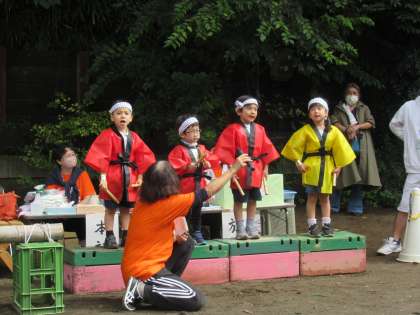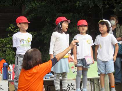 運動会では、同じ競技の司会の友達と一緒に、言葉を考えたり、覚えたり、練習して、年長さんが司会を頑張りました。
