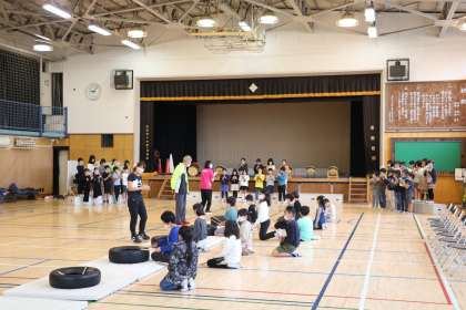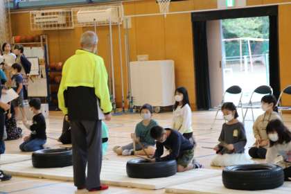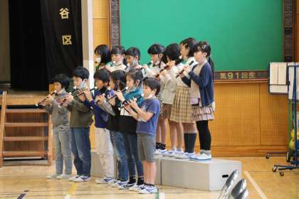 今日も石井戸囃の練習に石井戸囃保存会の先生たちに来ていただき教えてもらいました。今日は、各担当で分かれての練習でした。写真は体育館のリコーダーと締太鼓の練習の様子です。