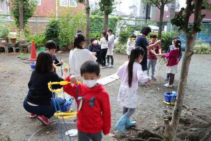 支柱に絡みついたツルをとるのも大変ですが、また支柱を元に戻すのも大変です。友達や先生にも協力いただき、一生けん命取り組んでいます。