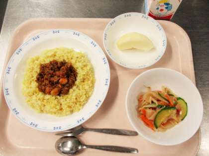 ふだんの食事でとりにくい豆類ですが、ドライカレーに入れると、無理なくおいしく食べることができます。今日のドライカレーに入っている豆はひよこ豆です。豆に突起があり形が鳥の頭に似ていることから名前がついたとされています。