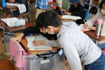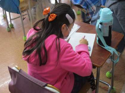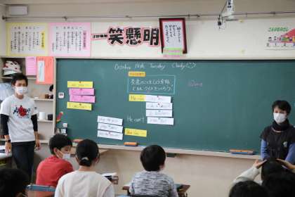 5年生の外国語の授業の様子です。今日は「can」を使って友達を紹介する文章を作っていました。友達にインタビューしてからプリントに英文を書いていました。友達の新しい一面を知ることができたかな?