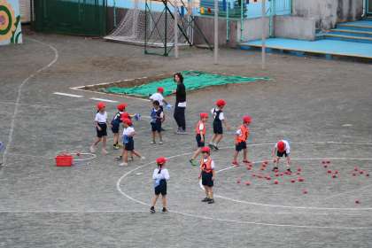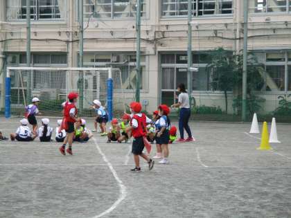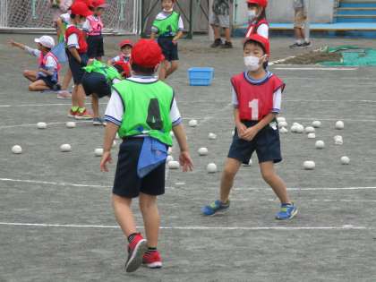 1年生の体育の授業の様子です。ボールを使ったしっぽ取りゲームをしていました。チームで作戦を立ててゲームに臨んでいました。チームで協力して活動できていました。