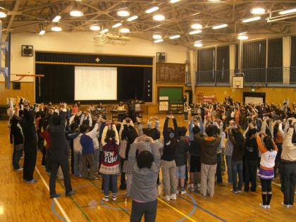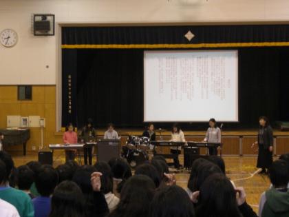 今月の歌は「勇気100%」。アニメでおなじみなので、低学年にも大人気です。「ドレミの歌」「ビリーブ」に続き、今年度3曲目の合奏クラブの伴奏です。全校が集まってまずは大きく背伸びから。ちょっとキーが高いのですが、シンセサイザーやドラムの音に負けない歌声でした。