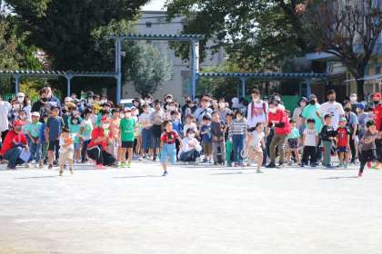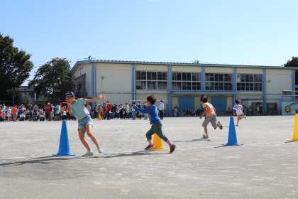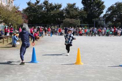 親子リレーです。子供も大人も全力疾走でバトンを繋ぎます。