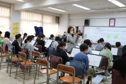 6年生音楽の様子です。卒業アルバム用に業者の方が写真撮影に見えています。