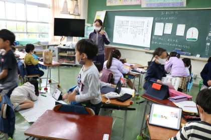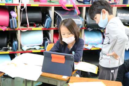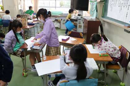 1年生は生活科で虫についてたくさん調べました。次は班ごとに発表する準備です。調べたことを大きな紙やカードにまとめています。班ごとに仲良く協働して取り組んでいます。