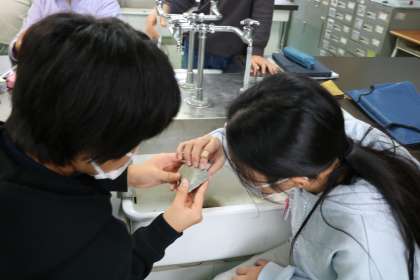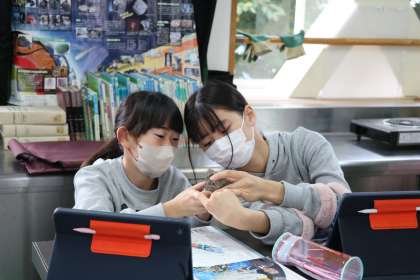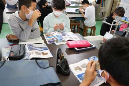 6年生理科「地層のでき方」の学習の様子です。様々な種類の岩石を手に取って観察しています。