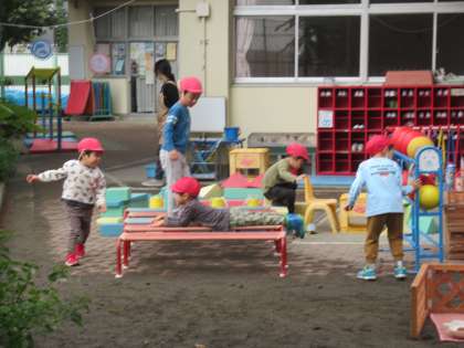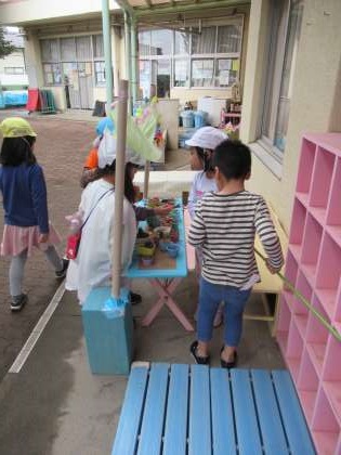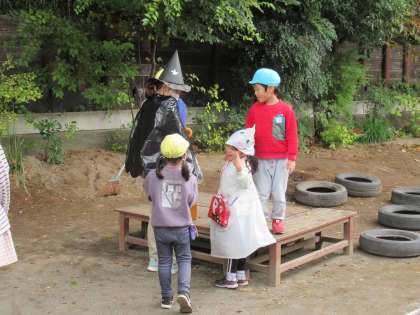 今日は、朝は少しお天気がぐずついたものの、雨があがり昼にはお日様も差してきました。秋の園庭では、木の実を使った遊び(ケーキ屋さん)や、ハロウィンごっこ(各々に自分で変身するものを作り、魔女やバンパイアなどになって遊んでいます)ベンチやビールケースなどを運んで場づくりをして家ごっこをしたりして楽しんでいます。、