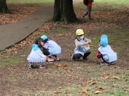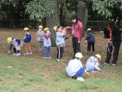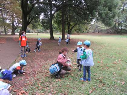 砧公園について、交流の時間までは、秋の実がたくさん落ちているところで木の実拾いをしました。たくさんのドングリを大喜びで拾ったり、「このドングリ、「帽子をかぶっているよ!」「なんか、このドングリスペシャルなんだよ」「見て、色が他のと違っているよ」など一つ一つのドングリをよく見たりしながら、楽しんで拾っていました。