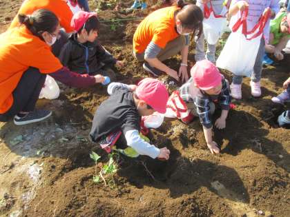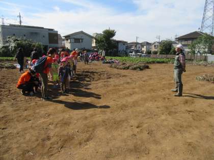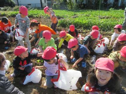今日は近くの清水さんの畑に、年少さんが芋掘りに行きました。