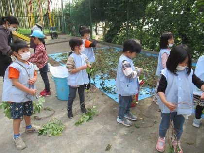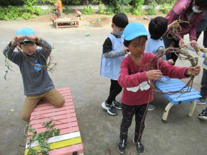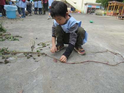 年長組は、自分たちで掘った畑の芋づると、清水さんの畑からいただいた芋づるを使ってリースつくりも楽しみました。手ではっぱを一つ一つ丁寧にとり、ツルを巻いていきます。「昔の人はこの葉っぱも食べていたんだって」という先生の言葉に「知ってる!」「なんで食べてたのかなあ」「御飯がなかったんじゃないの・・」など、話も弾みます。しっかり持って巻かないと形がすぐに崩れてしまいますが、素敵なリースにしたくて丁寧に取り組んでいました。