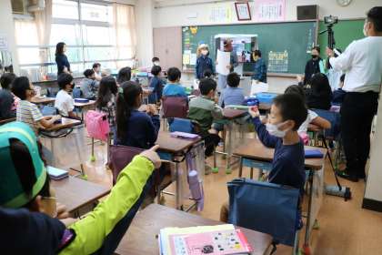教室のみんながクイズに正解だと、おばけたちは「やられた〜」と何やら宝をひらひら置いていきます。この教室には黄色い紙を置いていきました。