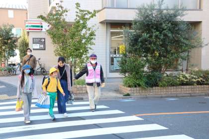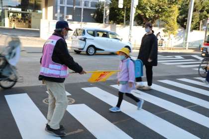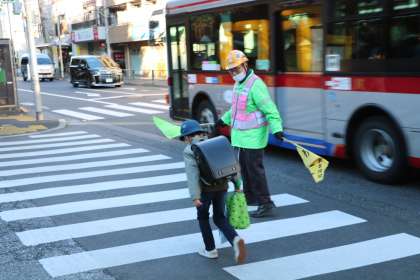 写真は、世田谷通りで毎朝7時から子どもたちの通学を見守ってくださっている地域の方です。町たんけんの勉強をしている2年生が、黄色コースの子から「毎朝いてくれる!」と聞き、びっくりしていました。