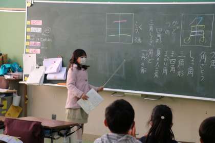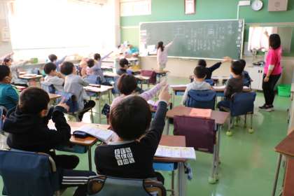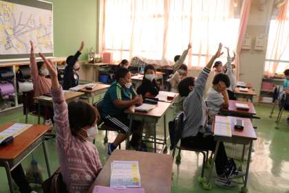 2年生国語、新出漢字の学習です。ミニ先生がリードしながら、書き順や、音訓読みを確認し熟語を出し合います。みんなとても意欲的です。