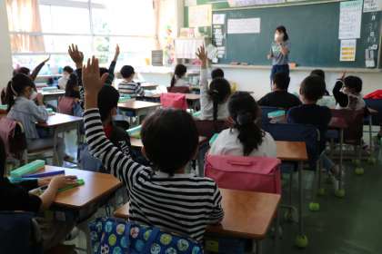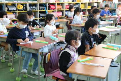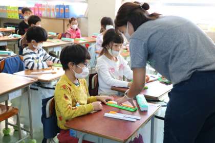 1年生算数の様子です。文章問題を読み、式を考えます。文章の中から大切な言葉をしっかり読み取ることや、ブロック等の具体物を操作することを、先生が丁寧に確認します。これからの算数に共通する大切なことです。