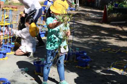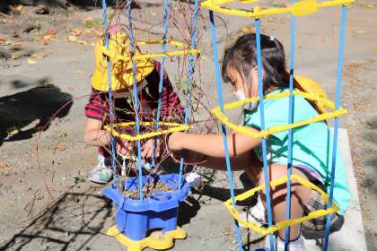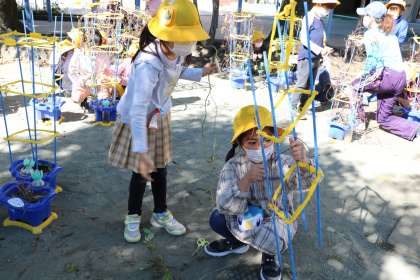 友達同士教え合ったり手伝ったりしながら、協力してリースを作っています。