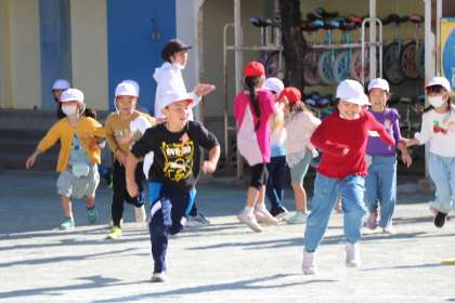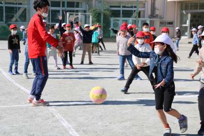 写真は2年生の様子です。先生と一緒に遊ぶのは楽しそうです。