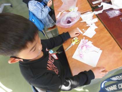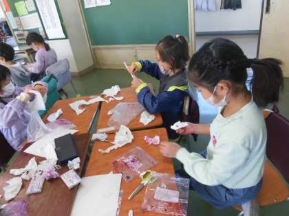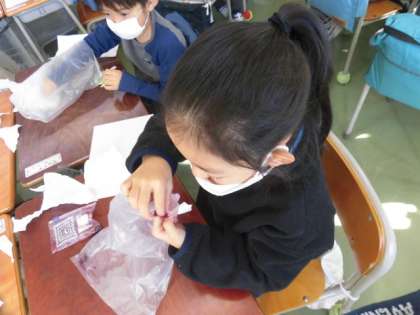 1年生は春から大切に一人一鉢アサガオを育ててきました。その朝顔の花を、夏頃から少しとっておき冷凍してありました。ビニールの中には、みんなのためておいた大切な朝顔の花が入っています。そのビニールを優しく手でもむと・・・きれいな色水ができました。その色水で、用意しておいた和紙を染めていきます。桜色のきれいな和紙ができました。