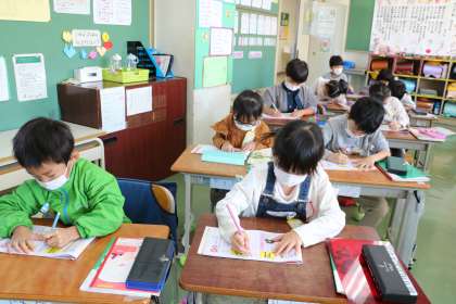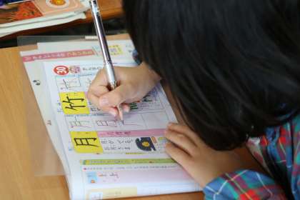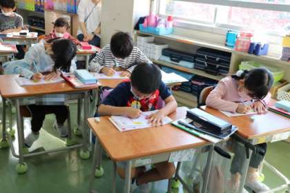 静かに集中して練習しています。上手に書けたときにニッコリ顔を上げて微笑んでくれるので、私も嬉しくなります。でも声は出しません。お友達が集中して書いていることを気遣い静かに挙手して担任の先生を待つことができる1年生がすてきです。