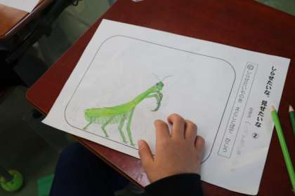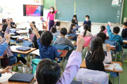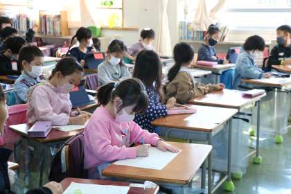 1年生の様子です。日直さんの「今日も一日がんばるぞー」のかけ声に、全員で「おー」と言って朝の会終了。すぐに切り替えて国語の学習です。先生の話を真剣に聞き、ワークシートに取り掛かります。