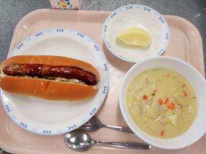 魚のチャウダーはまだらを使っています。まだらは一度オーブンで焼いてから、スープに加えています。魚のうまみがとけだしたクリームシチューで、こどもたちは「おいしい!」と食べていました。セルフウインナーサンドは、給食室で、パンに切れ目を入れて、バターとからしをぬり、炒めたキャベツをはさむところまでしています。こどもたちが食べる時に自分でパンにはさんで食べるスタイルです。ウインナーサンドが特に人気がありました。