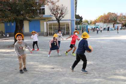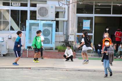日差しが温かい朝です。校庭では朝遊びが始まります。今日は正門で子どもたちを迎えました。5年生の男の子が