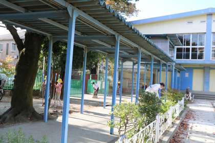 桜の葉がたくさん落ちてくるので、主事さんは落ち葉掃きに大忙しです。
