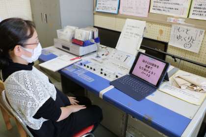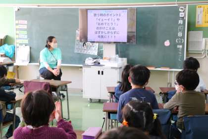初めに、歌の合間に手拍子をするところ、「いえーい!!」と手を挙げるところ、リズムに乗って体を動かしてもいいことなど、放送室から音楽の先生のお話を聞いてスタートです。