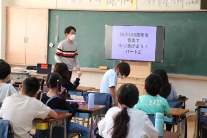 今朝は月に一度の音楽朝会です。今日は「砧小120周年を音楽で盛り上げよう!パート2」ということで、お誕生日をお祝いする歌を歌います。曲は「だれにだっておたんじょうび」です。