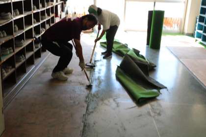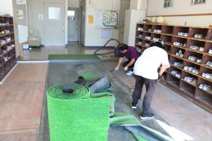 もちろん主事さんも、こまめにトイレや廊下を掃除し、きれいな状態を保つよう心がけてくれています。今日は、昇降口の人工芝を張り替える作業をしていました。子どもたちは、より気持ちよく昇降口を使えることでしょう。