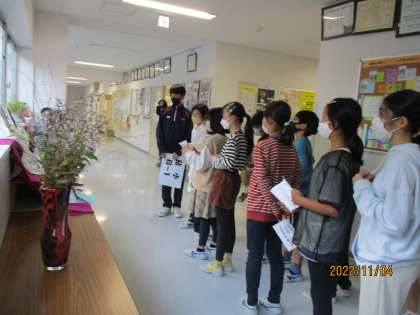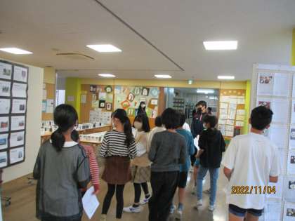体育館でお話を聞いたり、スライドを見せていただいたりした後は校内を案内してもらいました。教室前に掲示してある作品があまりにも立派なのでびっくり。そして、部活の紹介や、多目的ホールに飾ってある作品も素晴らしいのにさらにびっくりしている6年生です。