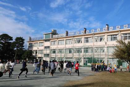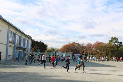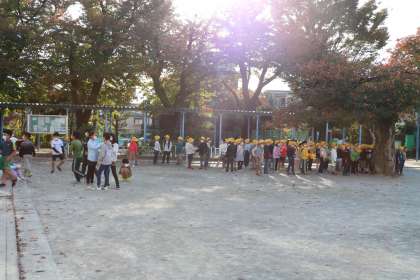 全校朝会のために並んで待っている下級生たち。2年生の子たちは