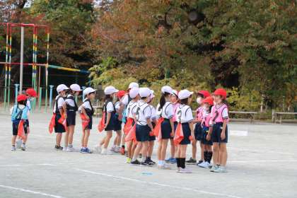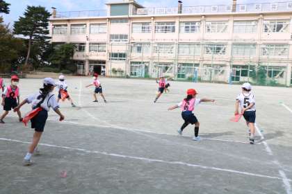 あいさつをしてゲーム開始です。チームの中で互いに声をかけ合って取り組んでいます。