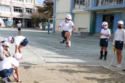 自分の班の友達が跳ぶ様子を真剣に見ています。記録を取るためではありますが、上手なところ、できていたことを言ってあげることでどちらの学びにもつながります。跳ぶ子だけでなく、どんな役割でも意欲的に真剣に取り組む砧っ子です。力がぐんと伸びる秘訣です。