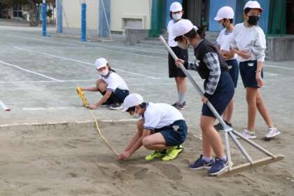 5年生体育「走り幅跳び」の様子です。班ごとに役割を交代しながら記録を取ります。
