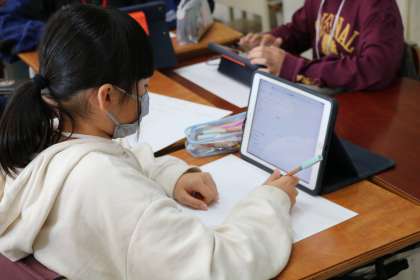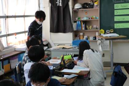 6年生の外国語の授業の様子です。今日は英語で都道府県クイズを作っていました。都道府県の特徴を英語で作文することが難しい様子でした。タブレットで都道府県の特徴や英単語を調べながら学習を進めていました。