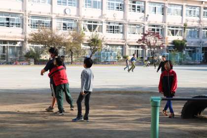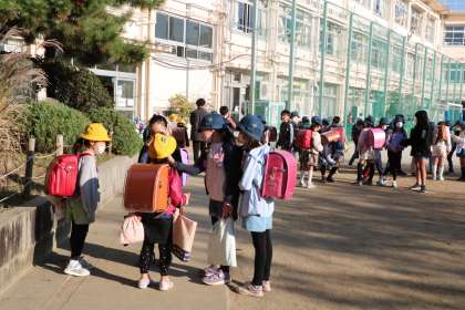 理科の先生と一緒にヘチマを観察する4年生、上級生とおしゃべりしながら登校する2年生。穏やかな朝です。