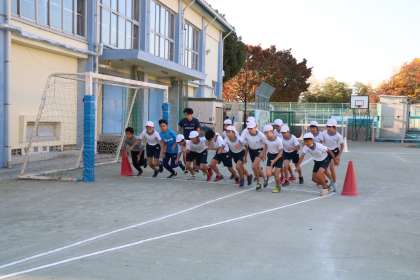 3つのグループに分かれて走ります。まずはAチームです。走っていない仲間や先生から「あと○周だよ」「いい走り!」「もっと追い込め〜!!」と応援の声が飛びます。