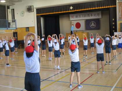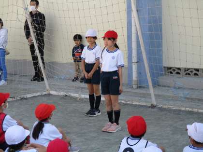 4年生のドッジボール大会の様子です。体育館で入念に準備運動をしました。校庭に出てからの開会式では、児童代表の言葉と先生からの諸注意が行われました。いい試合ができそうです。