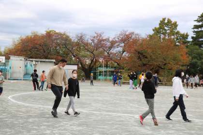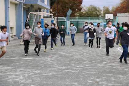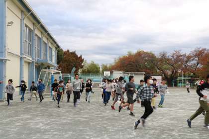 月曜日の朝は全校朝会です。5・6年生のランランランの後整列します。