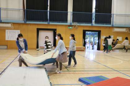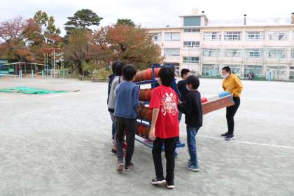そして6時間目に、6年生と先生たちと一緒に体育館式場作りをやりました。