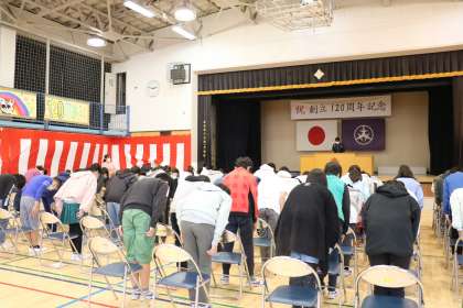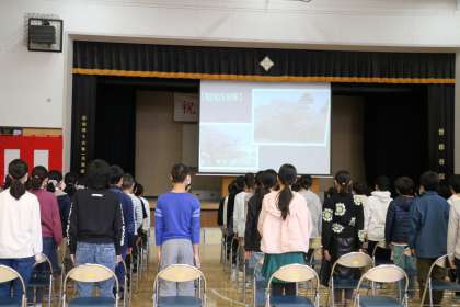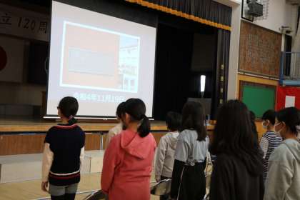 6年生は式典会場に参加し、呼びかけがあります。スライドの写真を見ながら砧小学校の歴史を振り返り、未来への決意を言葉にします。緊張感をもって、堂々とした態度で臨むその姿はさすが最高学年です。