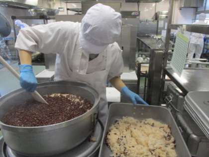 今日は120周年お祝い献立です。給食室でお赤飯を炊きました。