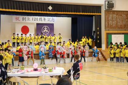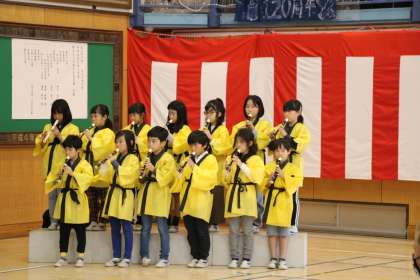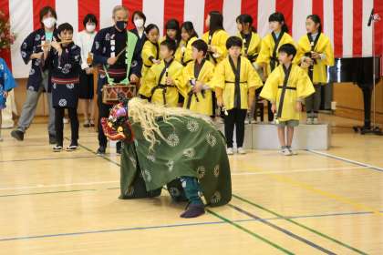 続いて3年生による石井戸囃子が披露されました。9月から練習してきた成果を出し切りました。子どもたちの充実した表情が印象的でした。最後に、石井戸囃子保存会のみなさんによる獅子舞も披露されて会場は盛り上がりました。