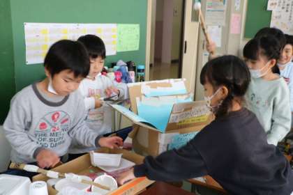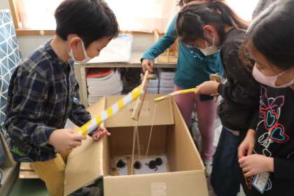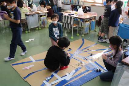 1年生生活科の様子です。秋のみを使ったゲームを仲間と一緒に作っています。作っては遊び、改良し、また作っては遊び・・・と、楽しそうです。
