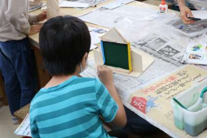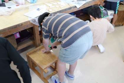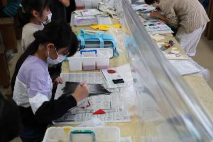 4年生の図工の授業の様子です。「つくってつかってたんしんで」という作品を制作していました。木の板を自由に加工して、組み合わせることで思い思いのオブジェにしていました。カラフルな色もつけていました。すてきな作品に仕上がりそうです。