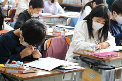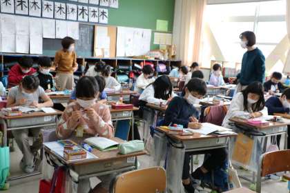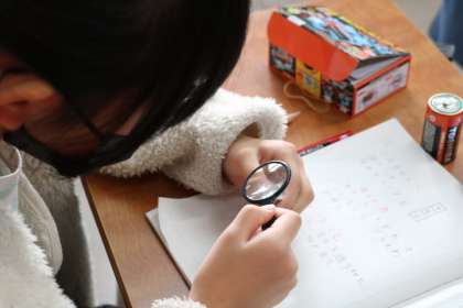 3年生「理科」の様子です。ちょうど見に行ったとき、豆電球を虫眼鏡で観察していました。