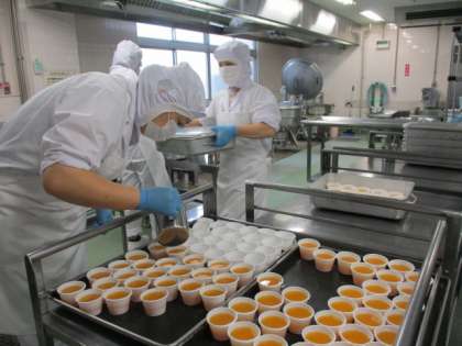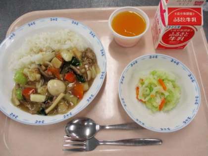 キャロットゼリーは、にんじんをゆでた後、ミキサーにかけてからオレンジジュースと一緒に寒天とゼラチンで固めて作っています。にんじんの栄養がたっぷり入ったゼリーです。味はオレンジゼリーなので、こどもたちはにんじんが入っていることに気づかず食べているようです。中華丼に入っている白菜は世田谷区の畑でとれたものです。