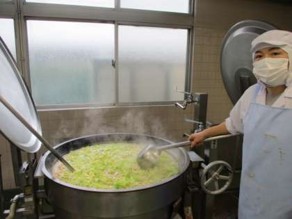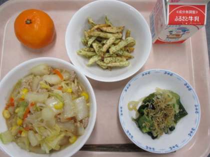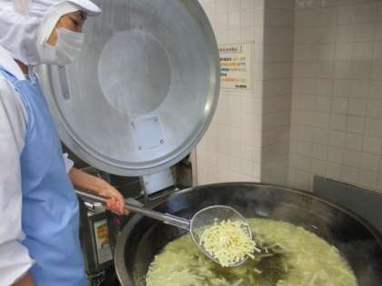 さっぽろラーメンはこどもたちからのリクエスト給食です。豚骨と鶏がらから、スープをとっています。こどもたちにあつあつのラーメンを食べてもらえるように給食室で時間ぎりぎりに仕上げました。フライドポテトはじゃがいもの皮をむくところから作っています。生のじゃがいもから作るフライドポテトはまた格別においしいです。これから寒くなりますが、栄養満点の給食を食べて2学期最後まで元気に過ごしてもらいたいと思います。